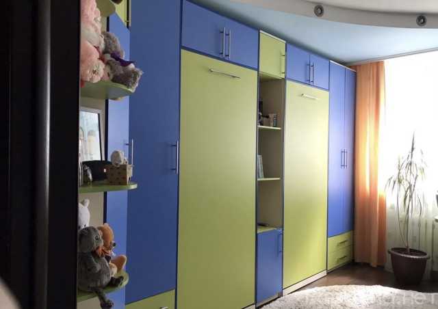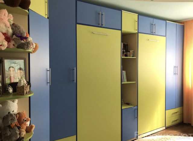 Продается детская стенка по индивидуальному заказу желто-синего цвета с функциональным дизайном. Комплект включает в себя 2 кровати с матрацем, шкаф под вещи, полки. Все элементы выполнены в едином стиле, что позволяет легко интегрировать их в интерьер детской комнаты.